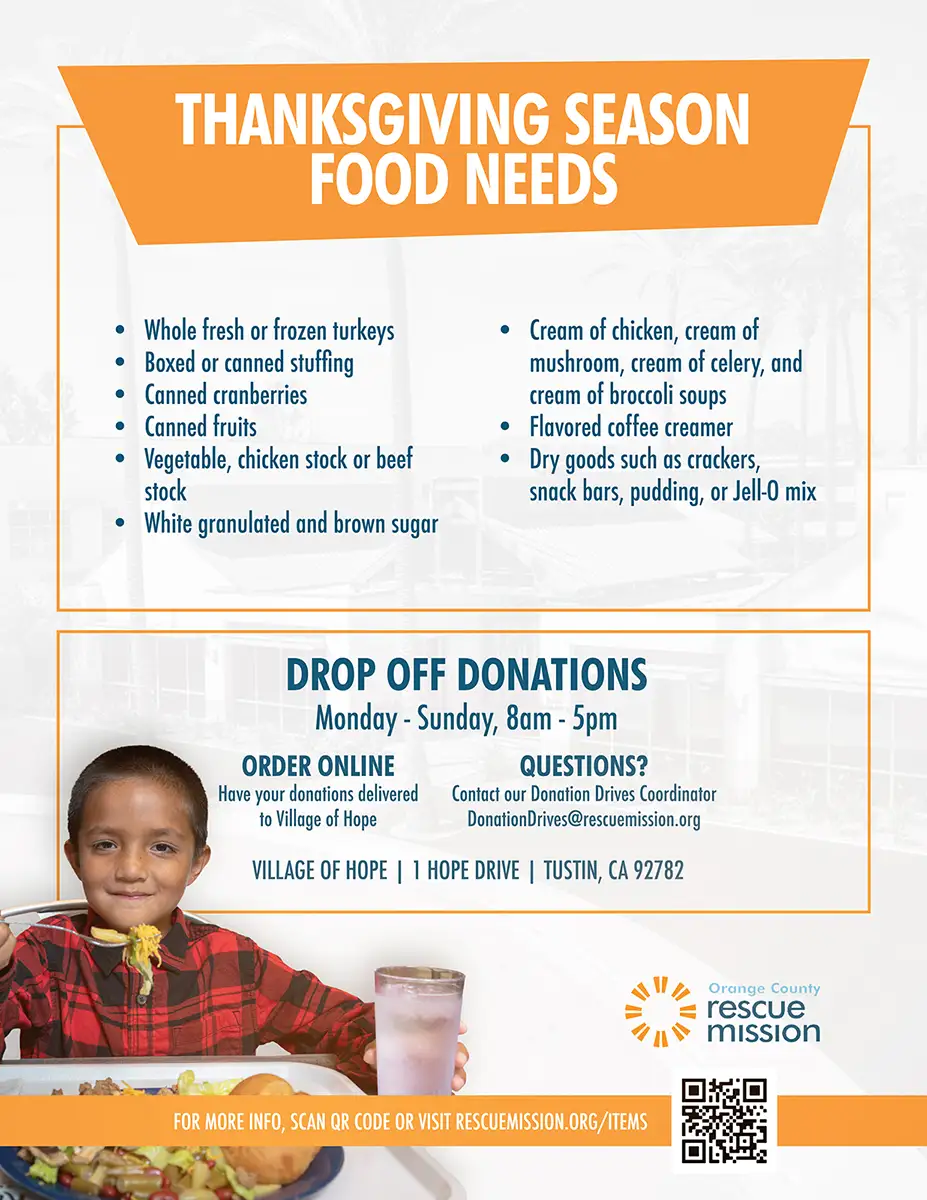 Order your donations online and have them delivered to Orange County Rescue Mission direct at: 1 Hope Drive, Tustin, CA 92782. For questions about item donations, please email info@rescuemission.org.